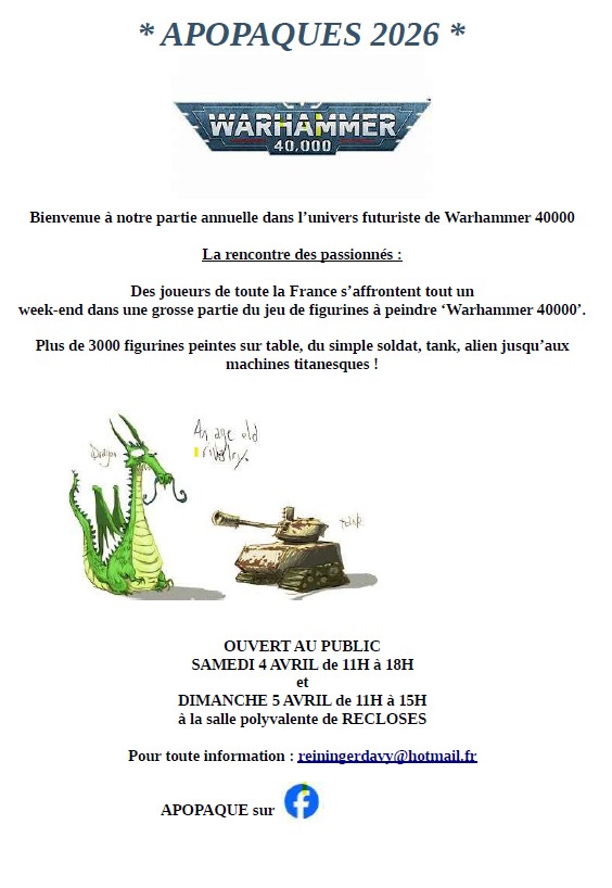 Bulles de Jeux vous invite dans l’univers des jeux de stratégies avec figurines à peindre, (Warhammer, Star-Wars, le Seigneur des anneaux, historique…) à la salle polyvalente de Recloses le samedi 4 avril 2026 de 11h00 à 18h00 et le dimanche 5 avril 2026 de 11H à 15H