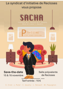 Le syndicat d’initiative de Recloses vous propose une pièce de théâtre “Sacha”, une comédie de L. Renaud & Y. Gaudry, mise en scène Y. Gaudry.